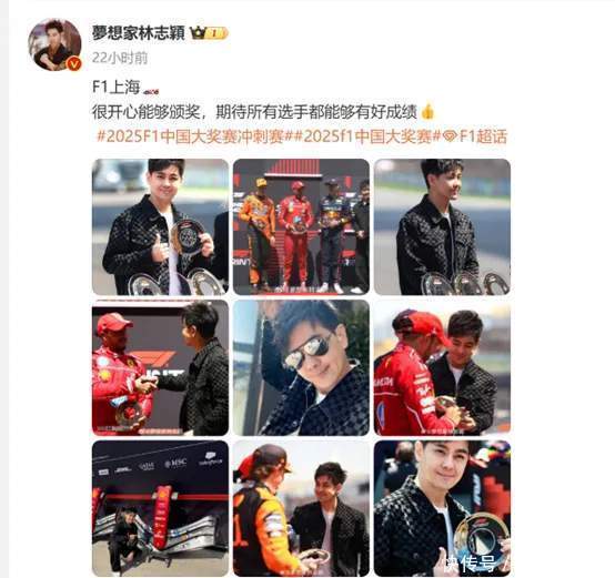知名艺人林志颖更新了社交平台,配文:F1上海,很开心能够颁奖,期待所有选手都能够有好成绩!